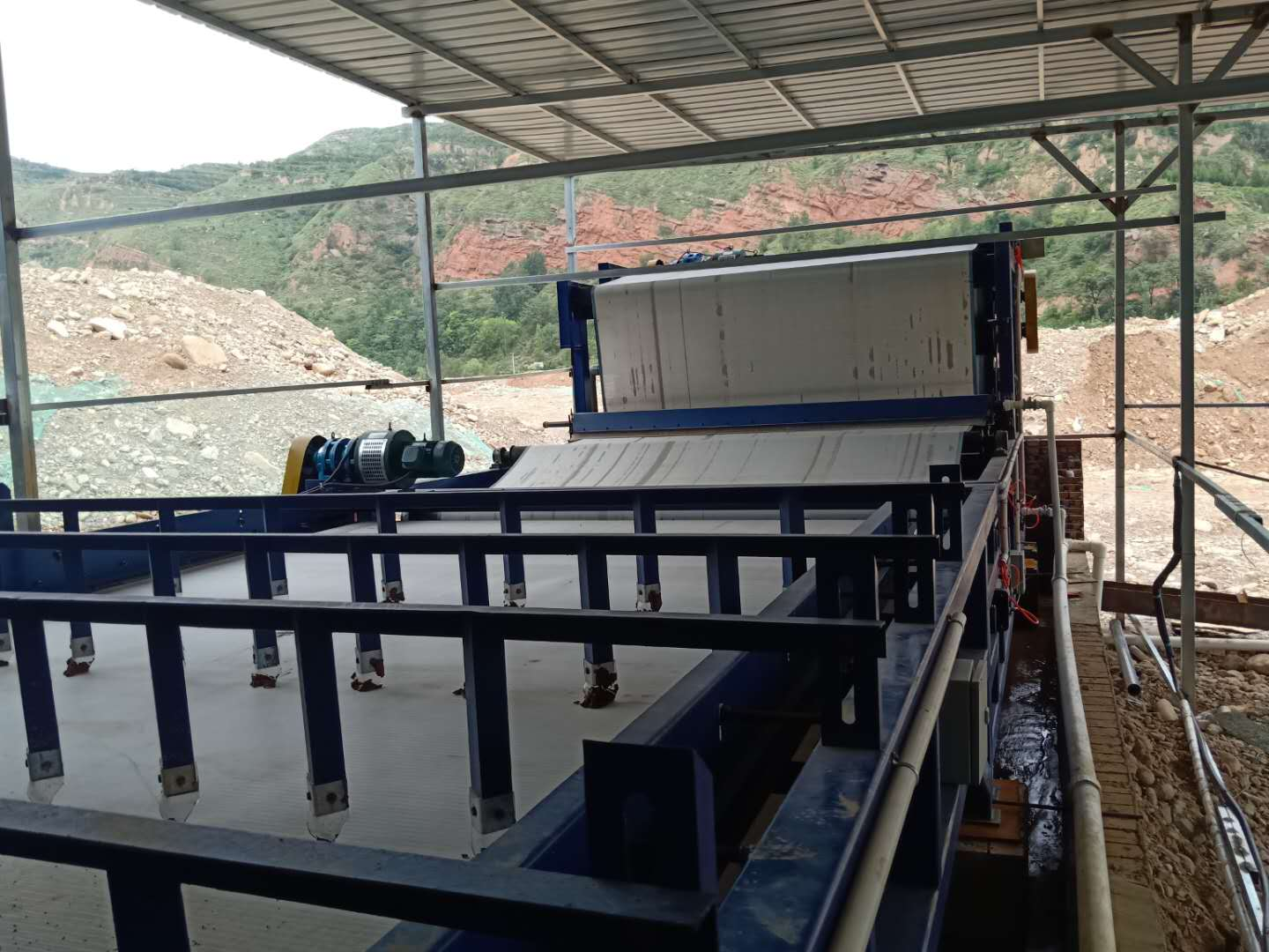 经过絮凝处理的污水形成絮团,使污水中的固体颗粒与水分离,通过布泥机构进入重力脱水区,并均匀分布到整个工作面的宽度上。在水的重力作用下,自由水与絮团分离,经滤带脱去滤浆中的大部分自由水。在这个过程中,滤带上方交错排列的耙泥系统在污泥中犁出水道,滤带下方的刮水组件支撑滤带,并将滤液刮走,使更多的自由水加速排放而改善脱水效果。该过程完成后,污泥基本失去流动性,有利于后续的压榨脱水。带有浓缩机的压滤机,其浓缩部分的功能与上述基本相同,但它具有单独的张紧机构和调偏机构。同时由于其滤带结构特殊,运行速度较快,重力脱水效果更佳。